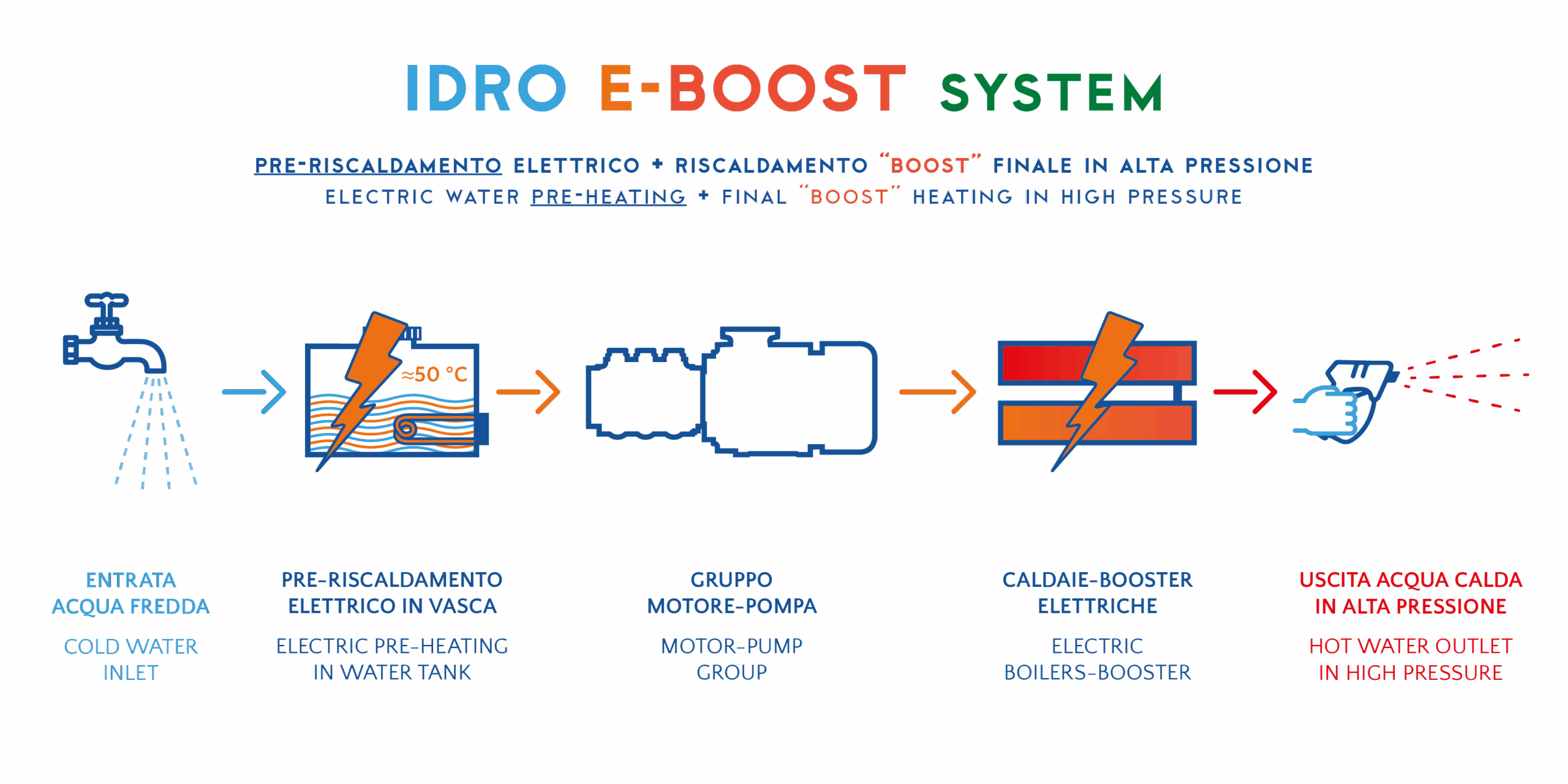 Durante l’utilizzo del getto in alta pressione, l’acqua già calda viene nuovamente riscaldata nelle caldaie elettriche (BOOST), raggiungendo rapidamente la temperatura di picco. A differenza delle tecnologie tradizionali con preriscaldamento, questo sistema pre-riscalda l’acqua in meno tempo e presenta una curva di decadimento della temperatura dell’acqua erogata molto più dolce e prolungata nel tempo, stabilizzandosi su temperature più alte. “Idro E-Boost System” consente un significativo risparmio energetico, utilizzando meno KW per il riscaldamento dell’acqua e raggiungendo alte temperature e alte portate. Questo sistema integra i benefici della tecnologia IdroElectric System, offrendo una soluzione ideale per chi necessita di alte portate d’acqua, ma dispone di pochi KW e lavora frequentemente per brevi periodi.